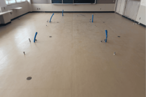 ①2F教室棟廊下 既存床シート撤去状況 ②2F教室棟廊下 既存床シート、接着剤撤去完了③2F教室棟廊下 下地処理状況④2F教室棟廊下 下地処理完了