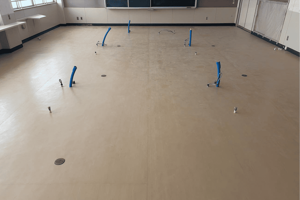 ①2025/8/20 昇降口、玄関 床シート張付け状況②2025/8/22 2F教室棟廊下 昇降口、玄関 床シート張付け完了③2025/8/28 普通教室 既存床タイル撤去状況④2025/8/29 普通教室 既存床タイル撤去完了