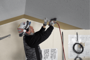 ①2026/1/20 家庭科室 腰壁 塗装状況 ②2026/1/19 音楽室 既存タイルカーペット 撤去状況 ③2026/1/20 音楽室 既存天井材 撤去状況 ④2026/1/22 音楽室 既存床材・天井材 撤去完了