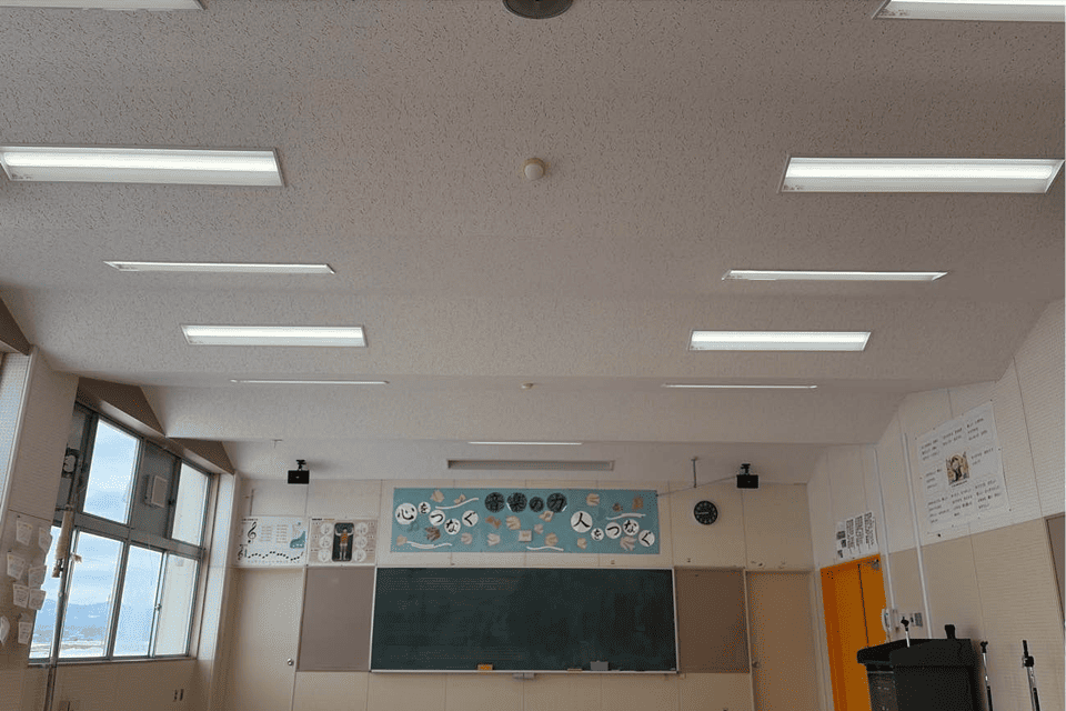 ①2025/11/7 トイレ 既存天井材撤去状況 ②2025/11/10 トイレ 既存天井材撤去 ③2025/11/24 普通教室 ビニル床タイル張付け状況 ④2025/11/28 普通教室 施工完了