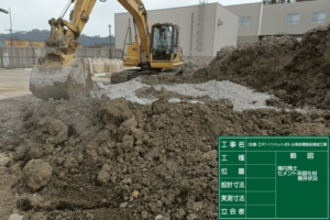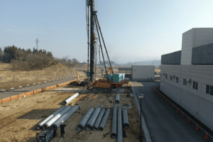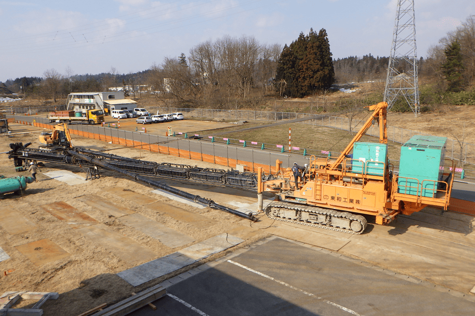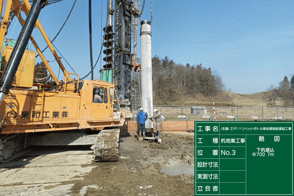 ①2026/3/17 杭打機搬入、組立状況②2026/3/25 既成杭打込み施工状況(全景)③2026/3/27 既成杭打込み状況④2026/3/30 発生土セメント改良状況