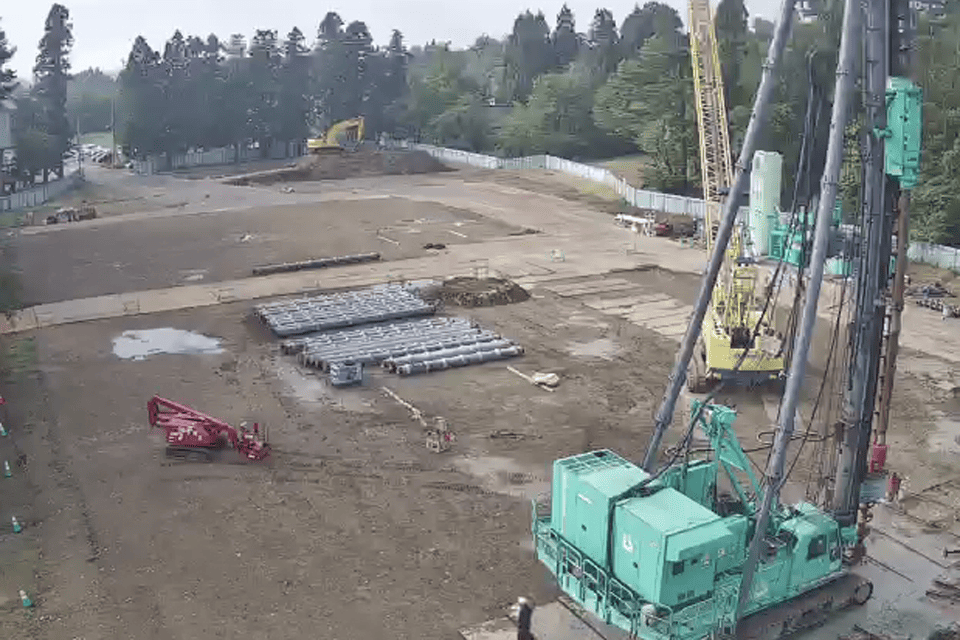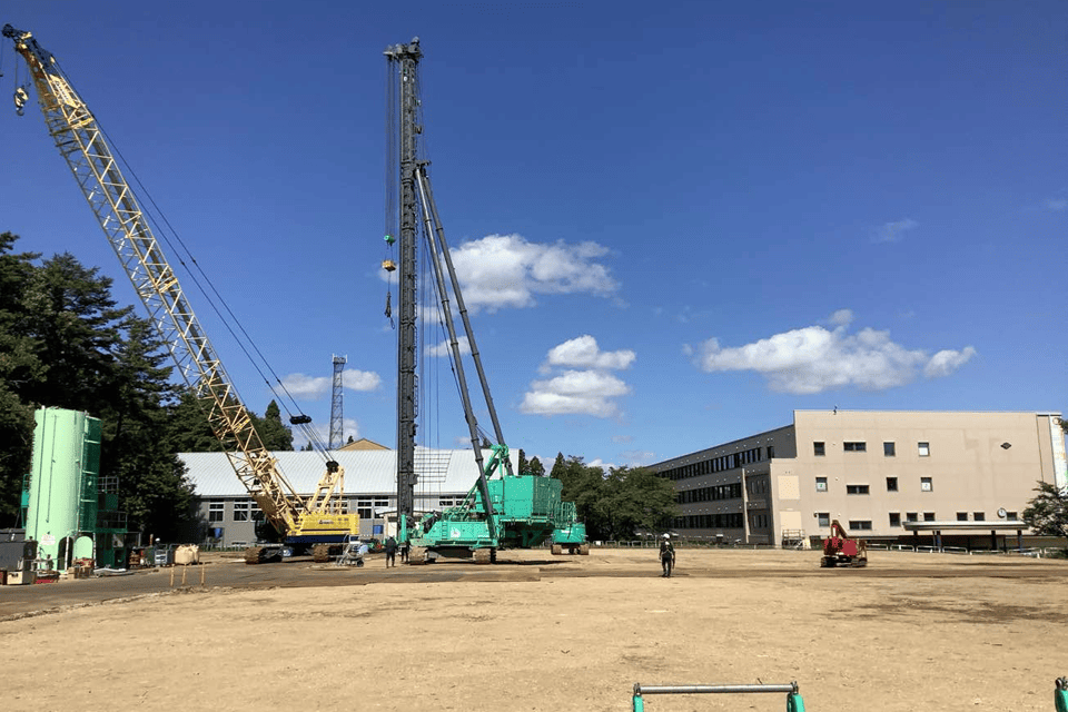 地盤改良(先行掘削~自走式土質改良~敷き均し・整地)、残土搬出、杭地業(機材組立~既成コンクリート杭打設)