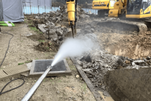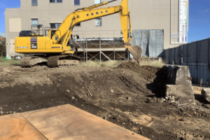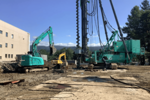 杭地業工事(既製コンクリート杭打設)、掘削・残土搬出、既存擁壁解体・搬出