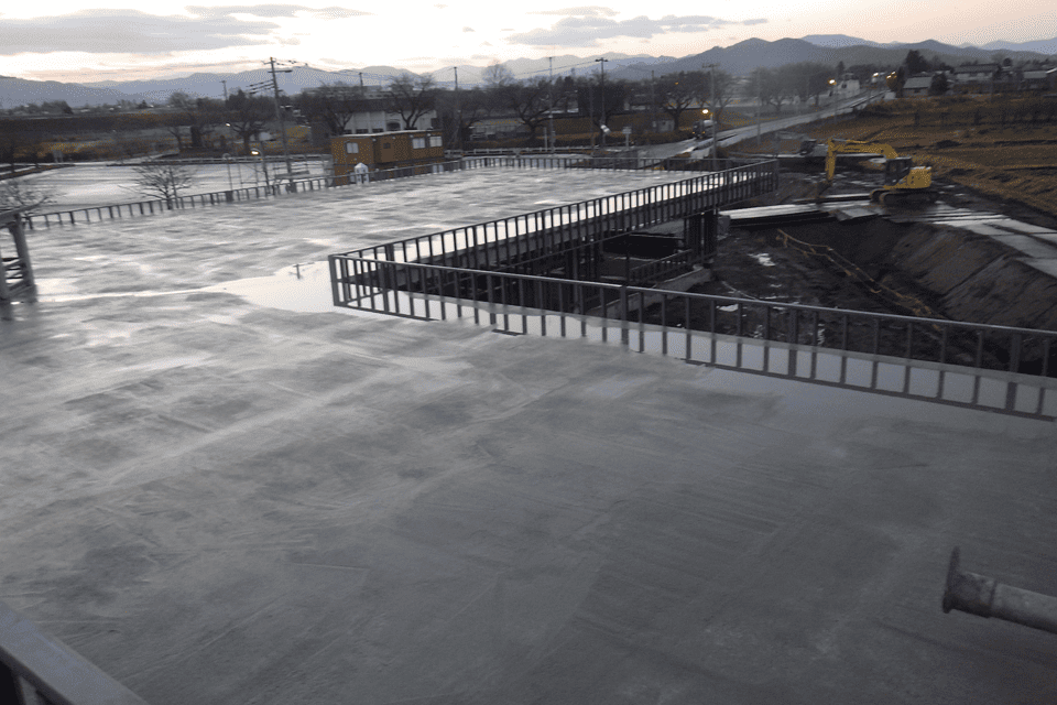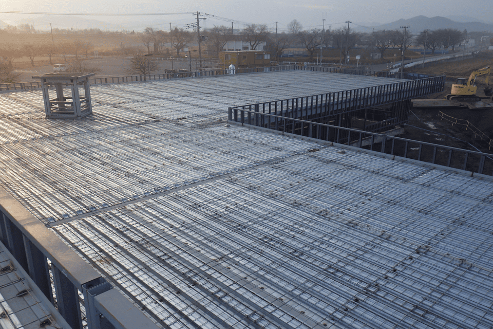 【鉄骨工事】鉄骨建方、胴縁、デッキ敷込 【鉄筋工事】デッキ配筋【コンクリート工事】デッキ打設