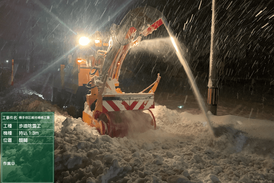 (1月1日):除雪工 新雪除雪(醍醐)除雪グレーダ作業中(1月12日):除雪工 運搬除雪(富士見交差点)排雪作業中 (1月12日):除雪工 運搬除雪(上真山)雪堤崩し作業中(1月20日):除雪工 応急処理(平林)雪崩対策
