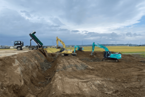 【河川土工】 盛土工:天端剥取り 土質改良 【排水施設工】 外郭工事用道路造成 オペレーター:5名 作業員:2名