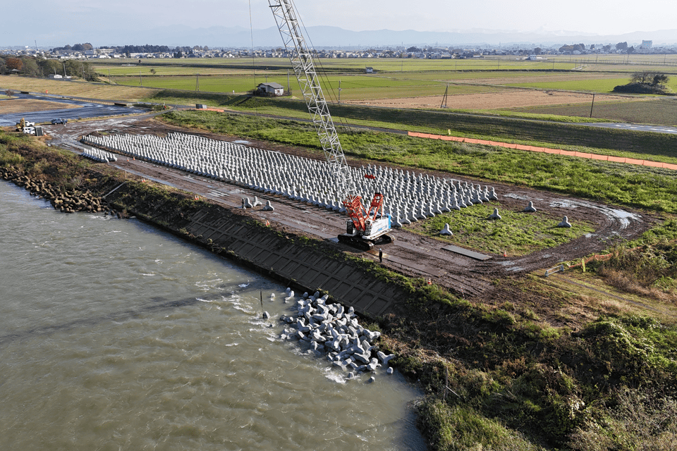 雄物川地区 根固めブロック受入れ、大雄地区:根固めブロック製作完了、坂路造成完了