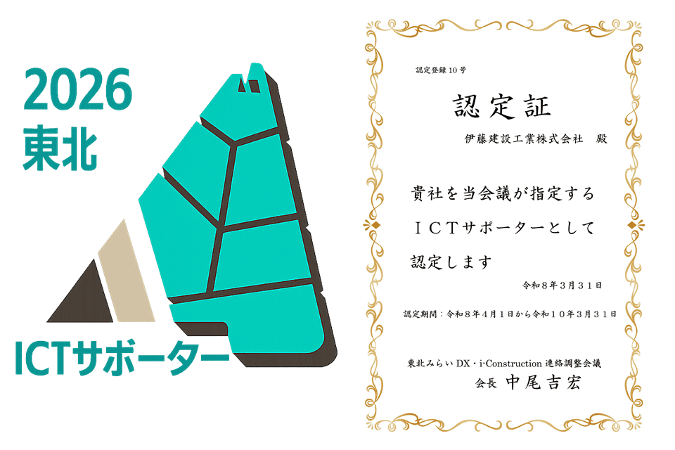弊社は、東北みらいDX・i-Construction 連絡調整会議(東北地方整備局)より、令和8年4月1日から運用が開始される「ICTサポーター」に認定されました。(認定企業100社、うち秋田県10社)